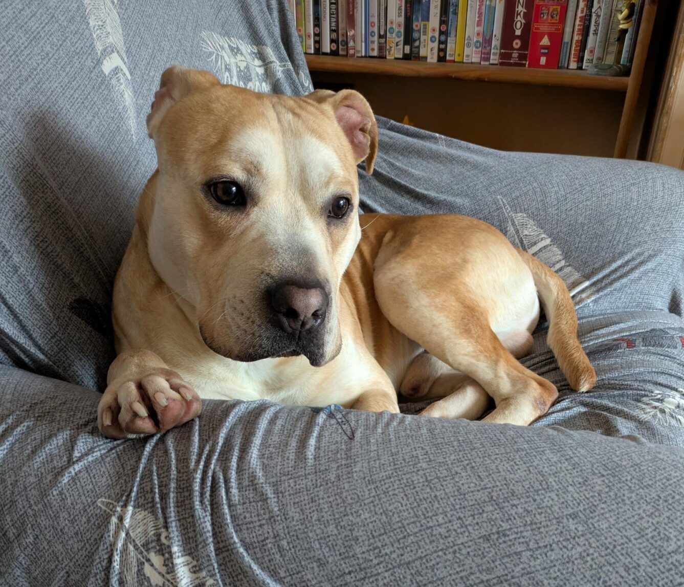 Gorgeous Milo came to us after he was sadly abandoned. He’s a friendly boy, and has been sweet with all of the staff at kennels. He likes other dogs and making friends out and about. He would like a home with an experienced owner that has had dogs before (ideally bull breeds), and a garden of his own to run about in (no communal gardens). He will need owners that are around for a large portion of the day to help him settle in.