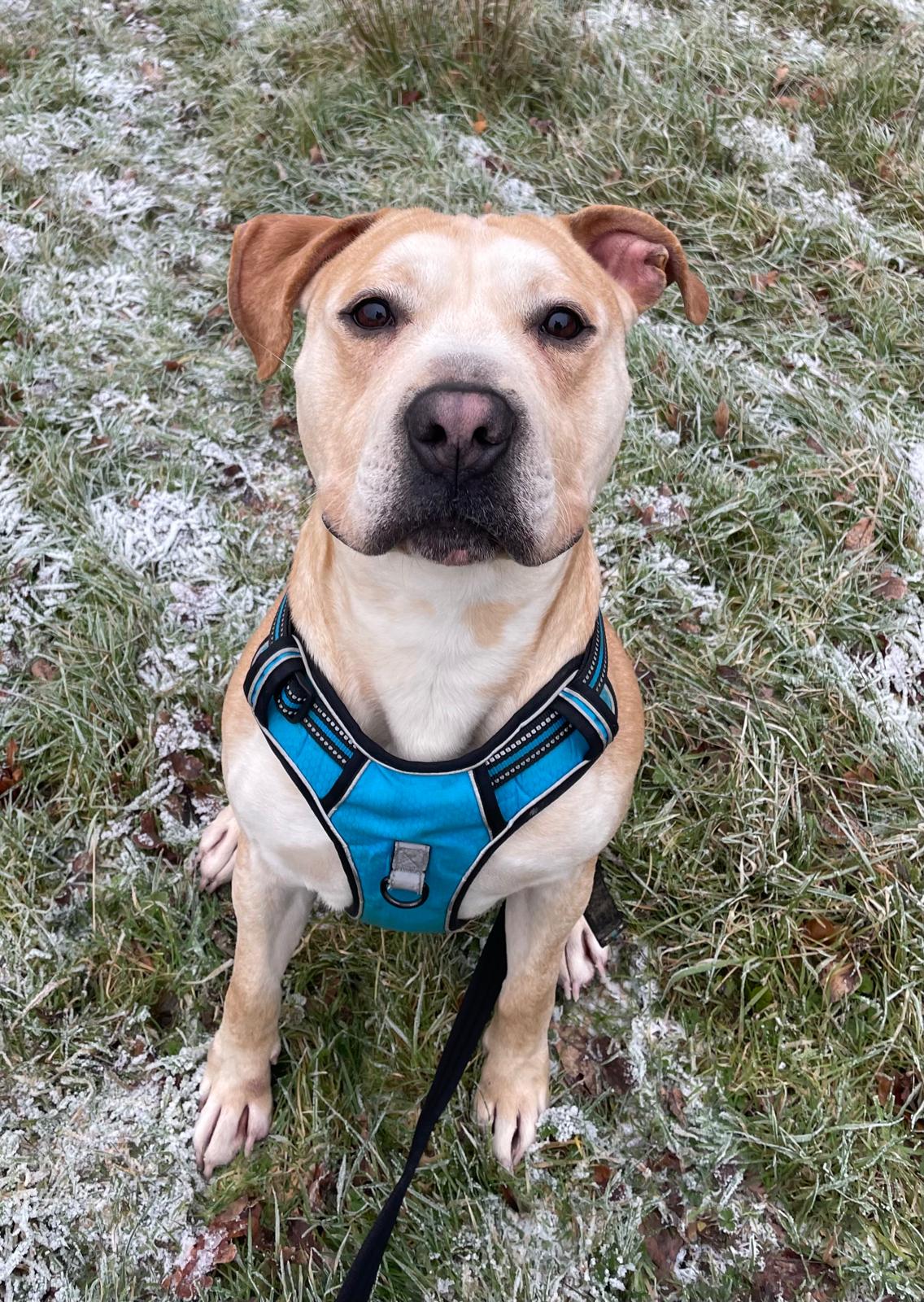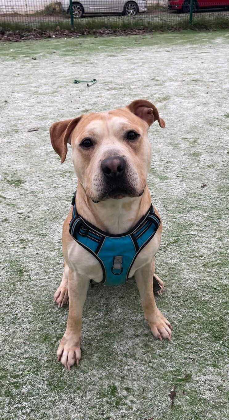 Gorgeous Milo came to us after he was sadly abandoned. He’s a friendly boy, and has been sweet with all of the staff at kennels. He seems to like other dogs and making friends out and about. He would like a home with an owner that has had dogs before (ideally bull breeds), and a garden of his own to run about in. He will need owners that are around for a large portion of the day to help him settle in.