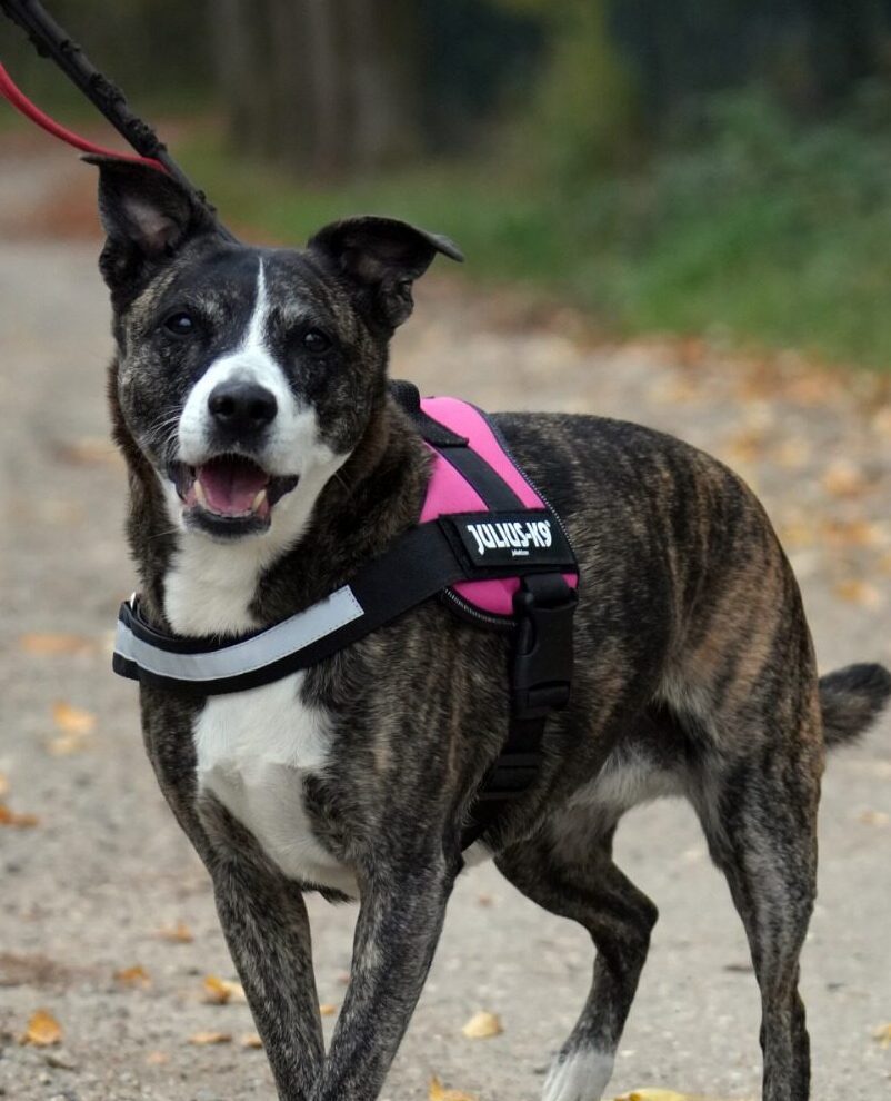 Gorgeous Pam came in after a change in circumstances. She’s a friendly girl that loves being around people and is very happy to receive a belly rub! She gets excited when she sees her harness and lead and likes going out on walks. She would like a home with owners that have had dogs before, and a garden of her own to explore. She is not a fan of spending time alone so will need new owners that are around for a large portion of the day. We’re sure she’ll make a lovely addition to her new home.