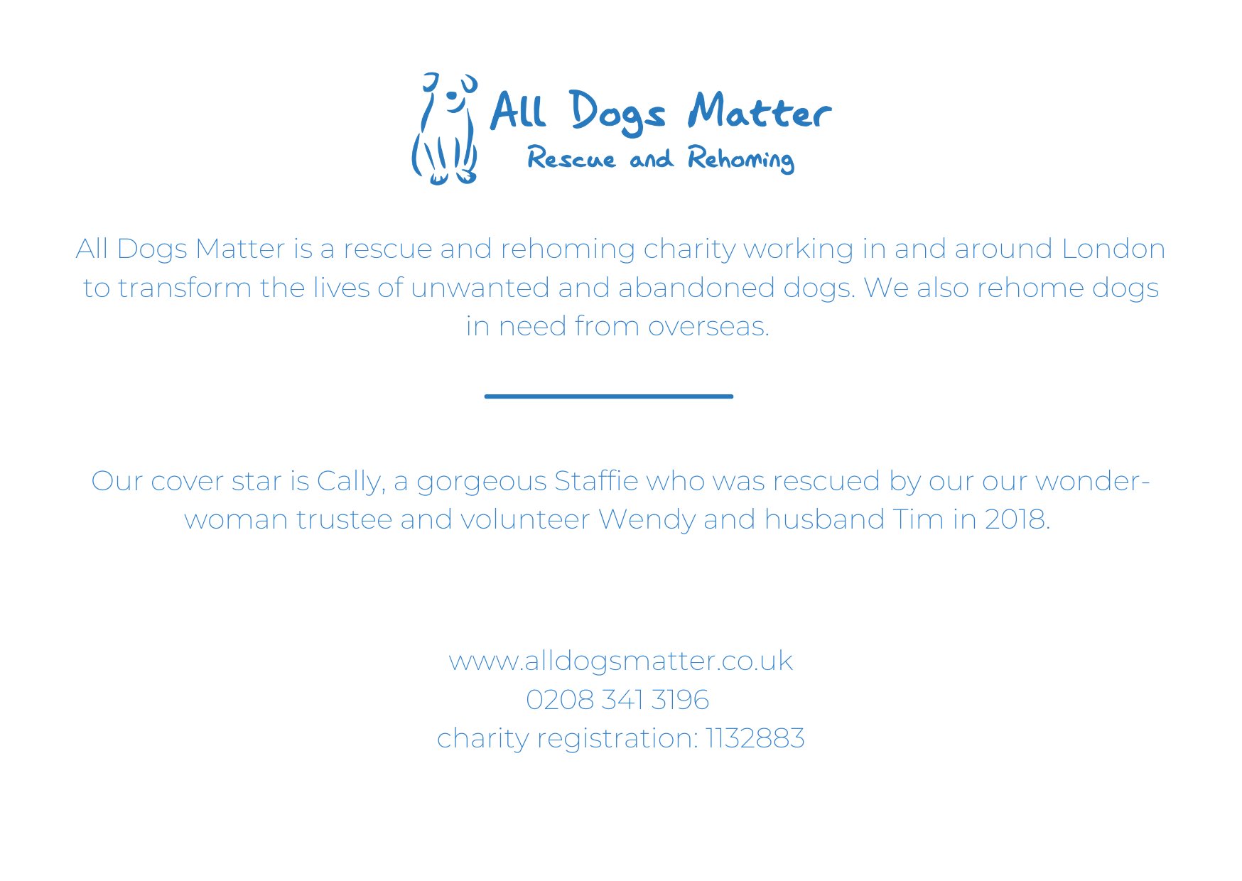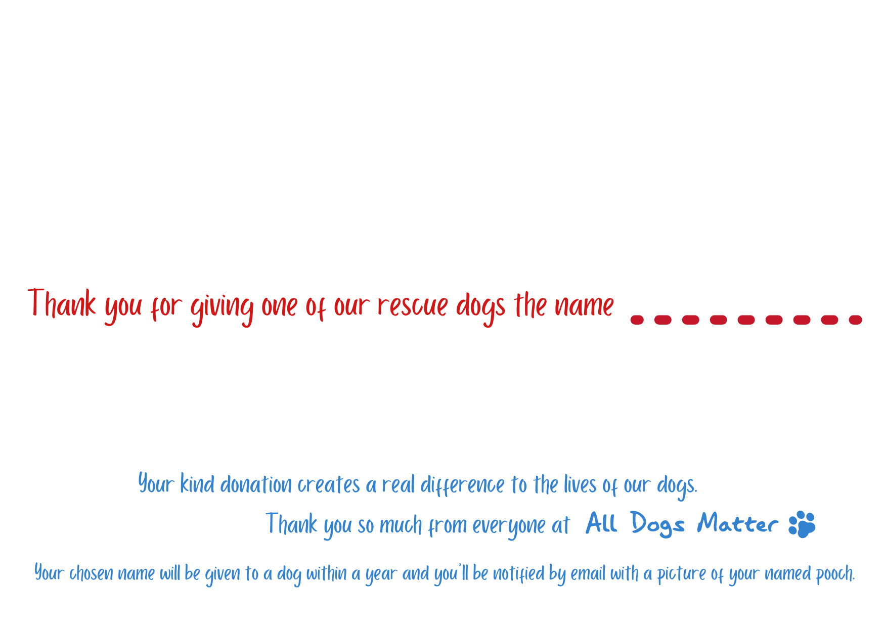 Please include your proposed name for a dog in the ‘Order notes’ section in the Billing Details of the checkout section or email info@alldogsmatter.co.uk. Thank you!